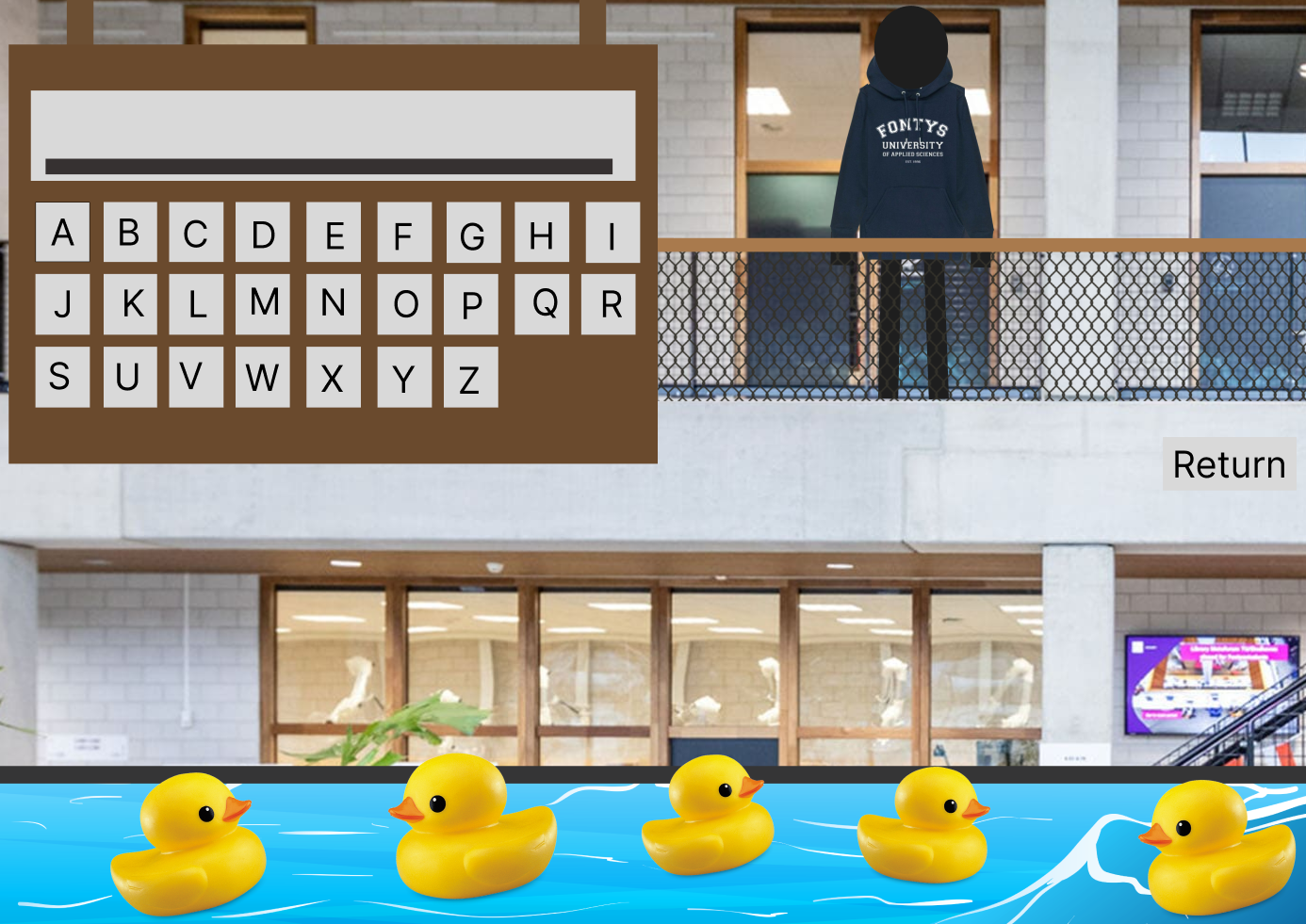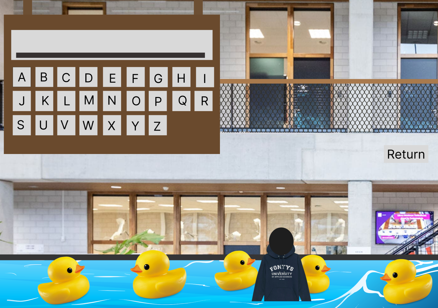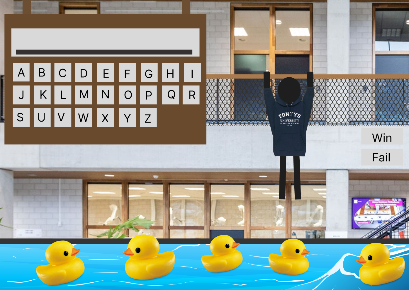 The game is based on the classic hangman, but with an exciting twist. Instead of the usual stickman, the player character is a student who wears a customizable Fontys hoodie, which adds a layer of personalization to the experience. Players can choose their building, providing an immersive connection to real locations.